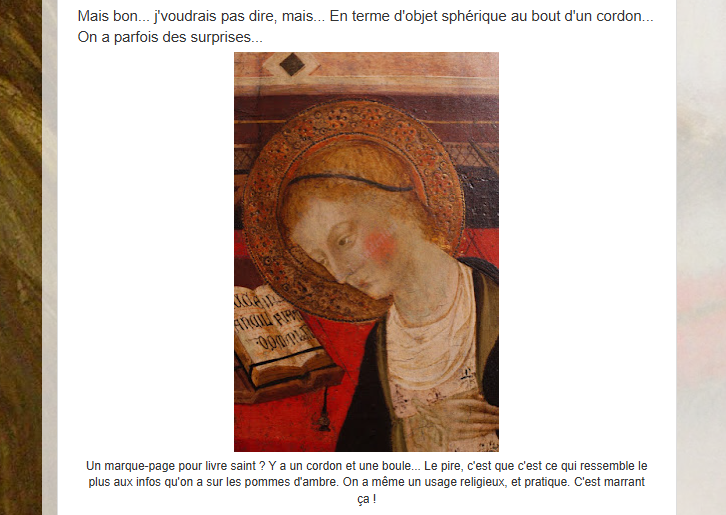 Certain(e)s ont voulu voir un pommander[02]un billet leur est dédié sur ce blog : https://mediaephile.fr/pommes-de-senteur-pommes-dambre-pomanders/  ainsi qu’une preuve que les pommanders avaient un usage principalement religieux (sic) sur l’Annonciation de Giovanni di Tano Fei (img 9).